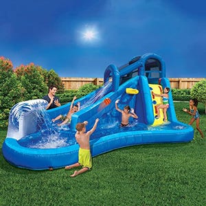 This Banzai Surf N' Splash Water Park drops from $499.99 to $244.09 when you click the on-site coupon at Amazon. Shipping is free. This water park has a climbing wall, slide, overhead sprayer, and a basketball hoop. It comes with an inflatable basketball, blower, and two water bags for extra stability. This set sells at other stores for $500!
