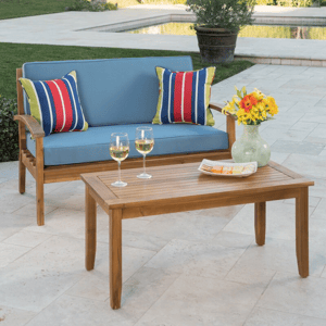 This Highland Dunes Barrentin 2-Person Outdoor Seating Group in Brown with Blue cushions, drops from $409.99 to $142.99 at Wayfair. Plus shipping is free. Similar solid wood sets go for $300-$600 at other stores. The 51" Loveseat comes with thick back and seat cushions.